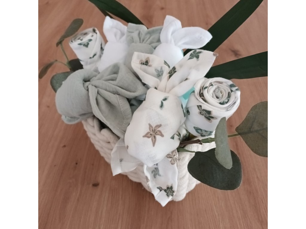 Obsahuje 2 klasické pleny a 5 mini plenek. Košíček zbyde třeba na drobnosti při péči o miminko - krémy, hřebínky, nůžtičky na nehtíky a podobné drobnosti, které rády různě zapadávají.